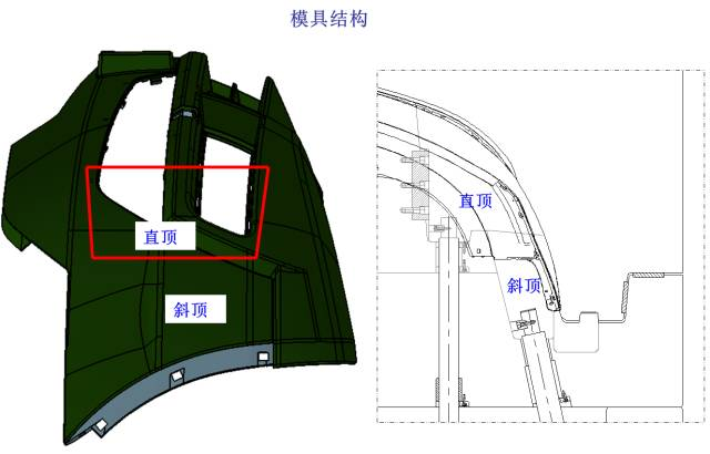 此側倒扣采用斜頂上斜頂?shù)慕Y構: