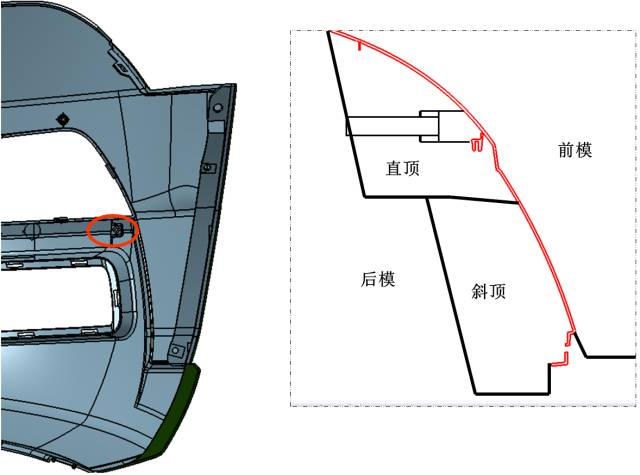 在汽車注塑模具中,針對汽車保險杠產(chǎn)品,模具設計時通常會采用先進的內分型面技術。其優(yōu)點是分型夾線隱藏在保險杠的非外觀面上,在汽車上裝配后看不到外觀夾線,不會影響產(chǎn)品外觀。但這種技術在難度與結構上都要比外分型保險杠復雜,技術風險也較高,模具成本與模具價格也會高于外分型保險杠很多,但因外觀美觀,在中高檔汽車中被廣泛應用。